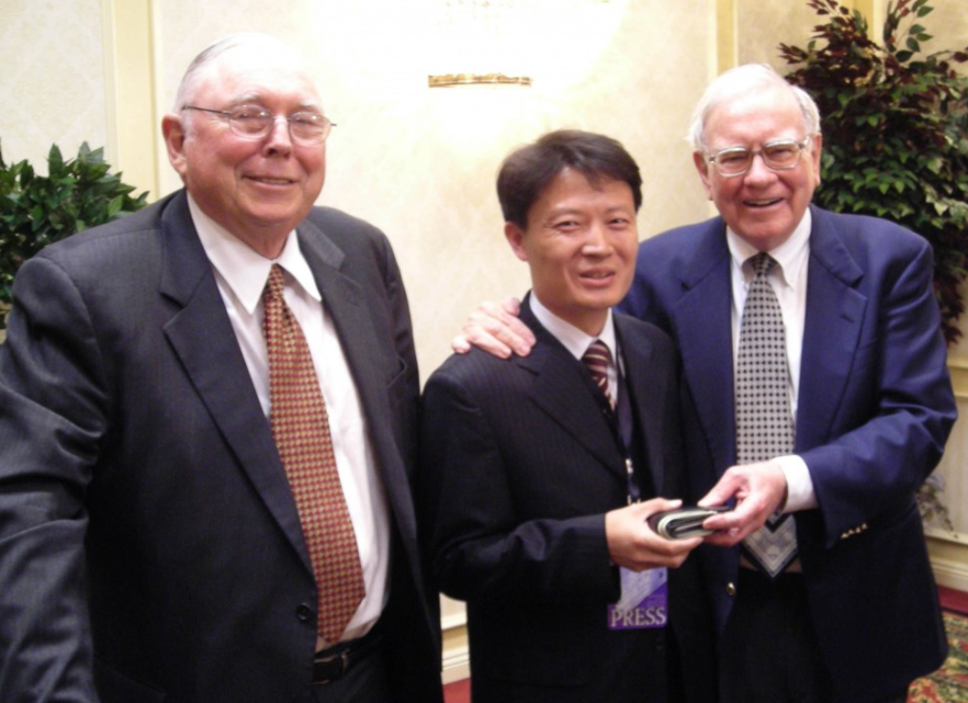 2007년 5월 6일(현지 시각) 미국 네브라스카주 오마하시 메리어트호텔에서 진행된 버크셔 해서웨이 주주미팅 기자회견에서 이민주(가운데) 당시 한국일보 기자가 워런버핏(오른쪽) 회장과 인터뷰를 마친 후 기념촬영하고 있다. 버핏 회장이 이민주 기자에게 자신의 지갑을 건내는 포즈를 취하고 있다. 왼쪽은 ‘버핏의 평생 동반자’ 찰스 멍거 버크셔 해서웨이 부회장.