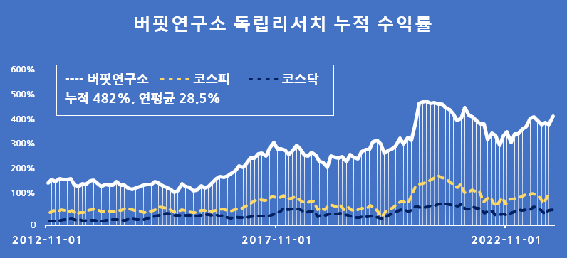 버핏연구소 독립리서치는 워렌 버핏으로 대표되는 가치투자(value investing)의 관점에서 분석과 탐방을 진행하고 이를 가반으로 독립 리서치를 생산해 호평 받고 있습니다. 성공투자를 위해 꼭 알아야 할 기업을 직접 탐방해 IR담당자, 임직원과 Q&A(질의응답)를 진행합니다. 2012년 9월 첫 보고서를 생산했고 이를 기반으로 운영한 가상 포트는 연평균 수익률 28.5%를 기록했습니다. 투자자분들의 재산 증식에 기여하는 성공투자 길잡이가 되겠습니다.
