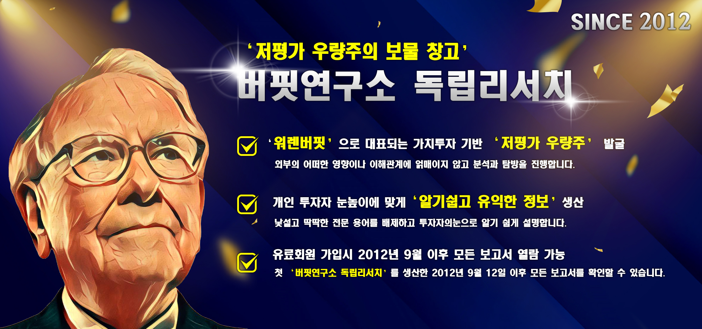 버핏연구소 독립리서치는 국내 최초 ‘개인 투자자를 위한 독립리서치'입니다. 2012년 9월 첫 보고서를 생산했습니다.