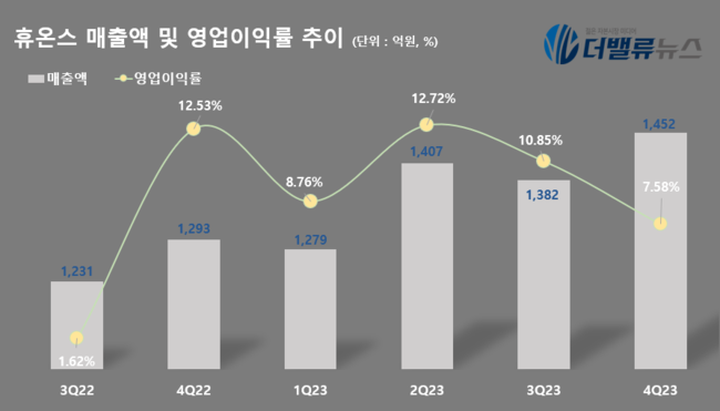휴온스(대표이사 송수영 윤상배)가 14일 지난해 4분기 매출액 1452억원, 영업이익 110억원, 당기순이익 92억원을 기록했다고 잠정 공시했다(K-IFRS 연결). 전년동기대비 매출액은 12% 증가했고, 영업이익은 32% 감소했다. 당기순이익은 144% 상승했다. 영업이익은 일회성 판관비 증가(상여금 등)와 2공장 초기 가동에 따른 비용 및 재고자산 충당금 설정으로 인해 감소했다.