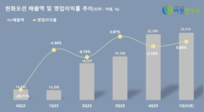 한화오션 최근 6개 분기 매출액 및 영업이익률 추이. [자료=버핏연구소]