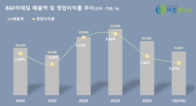 BGF리테일의 최근 6개 분기 매출액 및 영업이익률 추이. [자료=버핏연구소]