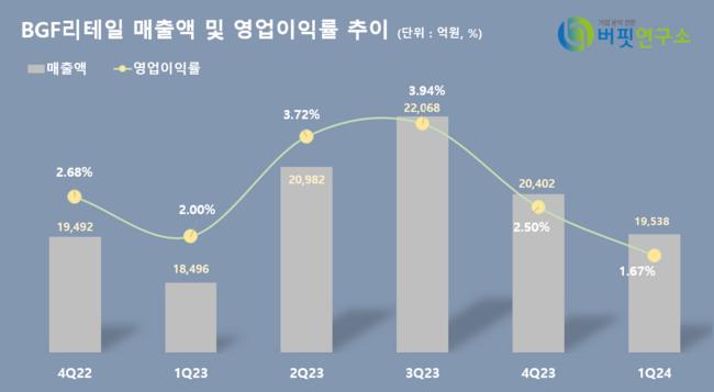BGF리테일 최근 6개 분기 매출액 및 영업이익률 추이. [자료=버핏연구소]
