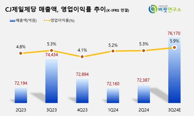 박성준 키움증권 연구원은 "CJ제일제당이 주식 시장의 변동성 확대로 주가가 20% 내외로 조정을 받은 상황이지만, 3분기 가공식품 매출 회복이 지속돼 매출액 7조6170억원(전년대비 +2.3%), 영업이익 4500억원(전년대비 +13.7%)을 기록할 것"이라고 했다.