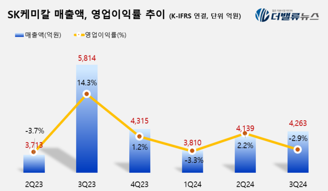 SK케미칼(대표이사 김철 안재현, 285130)이 올해 3분기 연결 기준 매출액 4263억원, 영업손실 125억원을 기록했다고 지난 5일 공시했다(K-IFRS 연결). 전년동기대비 매출액은 26.7% 줄었고, 영업이익은 적자전환했다. 다만 별도 기준 실적은 매출액 3319억원, 영업이익 295억원이다. 전년동기대비 각각 11.3%, 23.6% 증가한 수치다. SK케미칼 측은 “글로벌 수요 회복 지연 등 어려운 경영환경속에서도 지속적인 용도개발 및 고객 확대 노력이 코폴리에스터 판매량 확대로 이어졌다”며 “고내열·고투명 소재 에코젠 등 고부가 제품 판매 확대를 통해 견조세를 이어갈 것”이라고 설명했다.