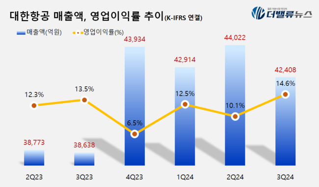 대한항공, 3Q 매출액 4.2조 전년比 10%↑...\대한항공 최근 6개 분기 매출액 및 영업이익률 추이. [이미지=더밸류뉴스]