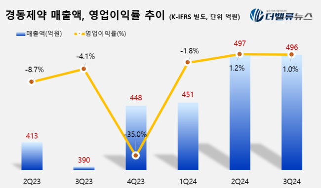 경동제약 최근 6개 분기 매출액 및 영업이익률 추이. [자료=더밸류뉴스]