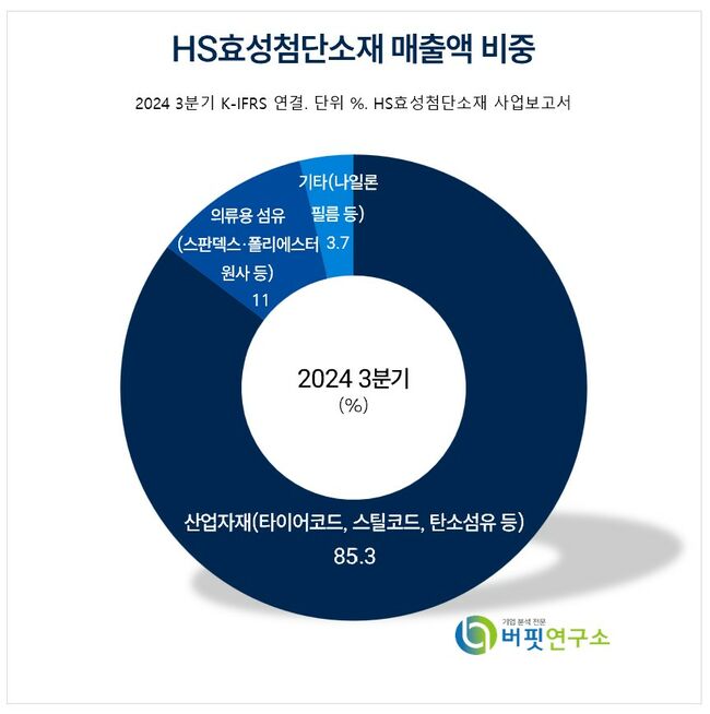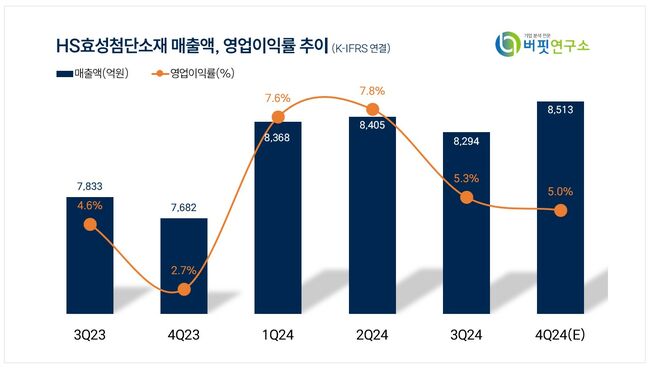 김 연구원은 HS효성첨단소재의 내년 영업이익을 490억원(QoQ +16.1%)으로 예상했다. 타이어보강재는 춘절 이후 성수기 진입 등 판매량 증가로 견조한 이익을 지속할 것으로 전망했다. 중국의 경기부양책 지속 등 아시아 지역의 수요 개선은 점진적으로 이어질 것으로 보인다.