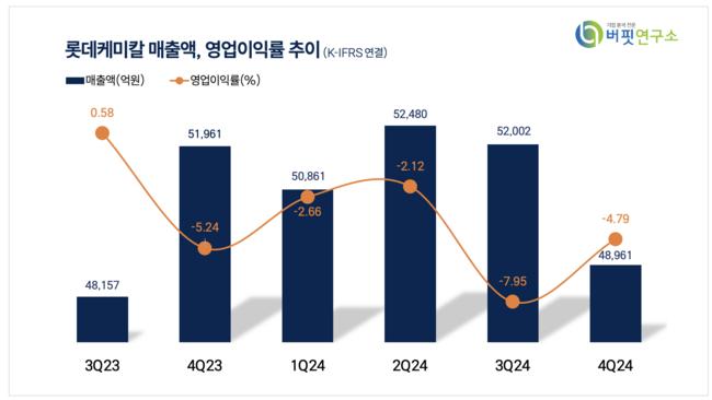 또한 “올해 롯데케미칼의 투자 판단 기준은 업황 턴어라운드보다는 구조조정 성과에 초점을 맞춰야 한다”며 “화학 업종의 공급과잉이 구조적 리스크로 작용하고 있지만, 단기적으로 롯데케미칼의 재무 건전성과 체질 개선 노력은 재평가될 필요가 있다”고 분석했다.