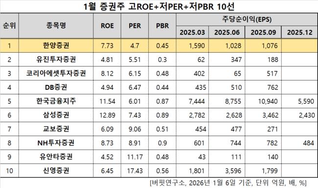 버핏연구소 조사 결과 한양증권이 1월 증권주 고ROE+저PER+저PBR 1위를 차지했으며, 유진투자증권(001200), 코리아에셋투자증권(190650), DB증권(016610)가 뒤를 이었다.