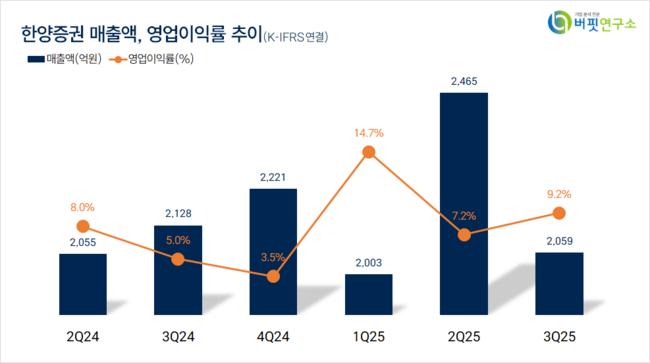 한양증권은 지난 3분기 매출액 2059억원, 영업이익 189억원으로 전년동기대비 매출액은 3.2% 감소, 영업이익은 70.6% 증가했다(K-IFRS 연결).