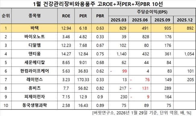 1월 건강관리장비와용품주 고ROE+저PER+저PBR 10선. [자료=한국거래소. 버핏연구소]