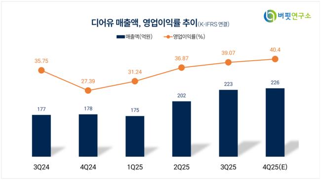 키움증권은 5일 디어유(376300)에 대해 고환율 효과와 웹 결제 비중 확대에 따른 수익성 구조 개선이 확인됐다고 평가했다. 2026년 연결 기준 매출액은 1081억원, 영업이익은 522억원으로 전망했으며, 투자의견 매수와 목표주가 5만3000원을 제시했다. 전일 종가는 3만8000원이다.