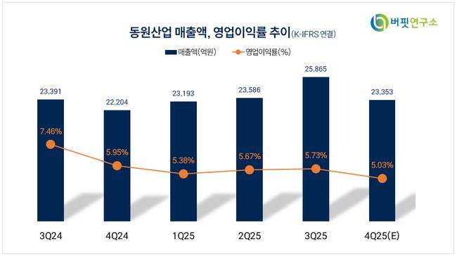 심은주 하나증권 연구원은 “25년 4분기 연결 매출액 및 영업이익은 각각 2조3192억원, 1090억원이다”며 “동원산업 별도 손익은 전년대비 소폭 감소했는데, 견조했던 어가에도 불구하고 전년대비 어획량이 감소한 탓으로 사료된다”라고 밝혔다.
