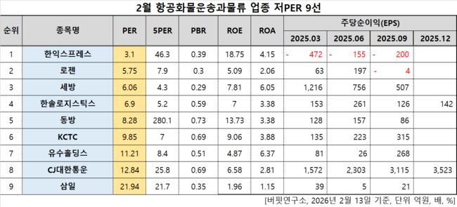 2월 항공화물운송과물류주 저PER 9선. [자료=버핏연구소]