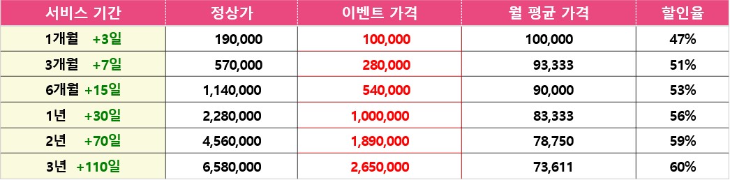 이벤트 기간에 가입하면 최대 60% 할인된 가격에 핑크 페이퍼를 이용할 수 있다. 보너스 일수도 푸짐하게 제공된다. 1년 가입자의 경우 이벤트 가격 100만원이며, 정상가 228만원 대비 30% 할인된 금액이다(VAT 별도). 또, 보너스 일수 30일이 별도 제공된다. 장기 회원으로 가입할 수록 할인폭과 보너스 일수가 늘어난다.