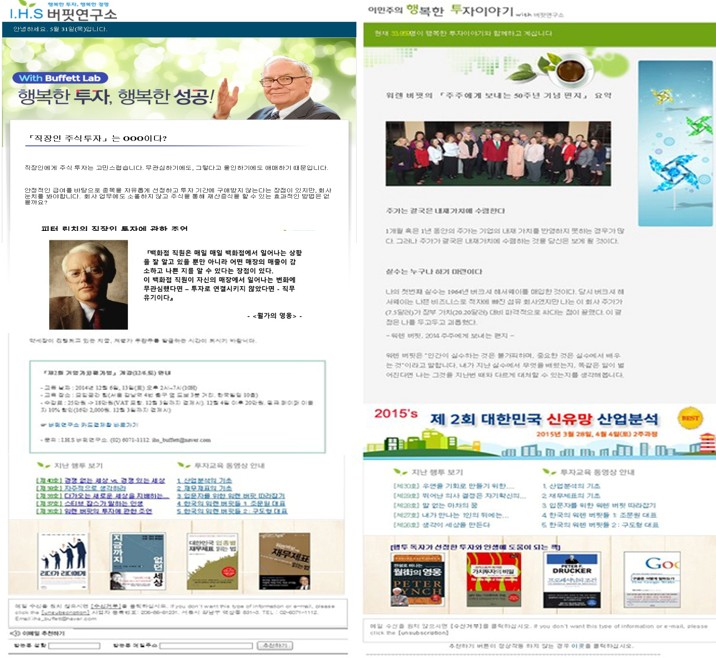 버핏연구소는 공식 이메일 템플릿 외에 「이민주의 행복한 투자 이야기」라는 제목의 이메일링 서비스도 제공하고 있다(위 사진 오른쪽). 「이민주의 행복한 투자 이야기」 이메일은 인생, 경영, 투자에 관한 조언을 담고 있어 직장인, 창업가, 자영업자, 대학생, 주부들을 애독자로 롹보하고 있다.