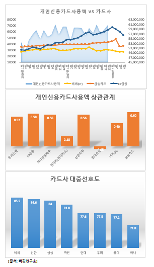 한국은행경제통계시스템(ECOS)에서 공개한 2016년 1월부터의 개인카드 사용액 추이와 월별 삼성카드의 주가는 0.6, KB금융(국민카드)의 주가는 0.58의 상관관계(correlation coefficient)를 보였다.