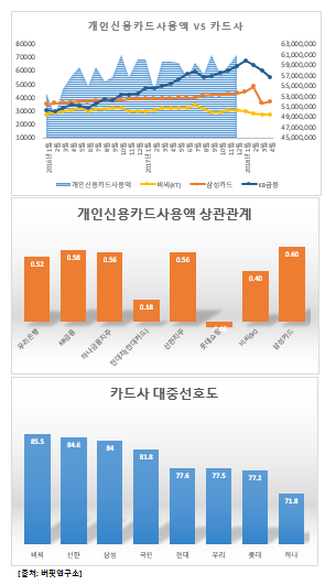 한국은행경제통계시스템(ECOS)에서 공개한 2016년 1월부터의 개인카드 사용액 추이와 월별 삼성카드의 주가는 0.6, KB금융(국민카드)의 주가는 0.58의 상관관계(correlation coefficient)를 보였다.