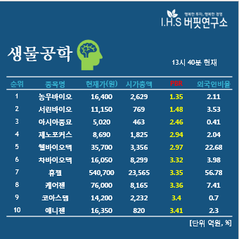 [버핏연구소=노성훈 기자] 09일 오후 1시 40분 현재 생물공학 기업 가운데 PBR(주가순자산배수)가 가장 낮은 종목은 농우바이오(054050)(1.35배)이다. 이어 서린바이오(038070)(1.48배), 아시아종묘(154030)(2.46배), 제노포커스(187420)(2.94배)가 뒤를 이었다.