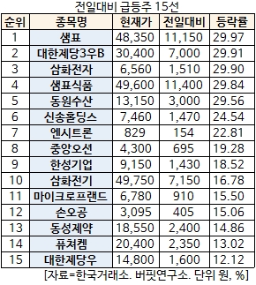 코스피 시장에서는 샘표(007540)가 전일대비 29.97% 오른 4만8350원에 장을 마감했다. 또 대한제당우3B(001799)(+29.91%), 삼화전자(011230)(+29.90%), 샘표식품(248170)(+29.84%) 등이 상한가를 기록했다.