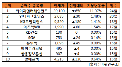 [버핏연구소=이주영 기자] 10일 코스닥 시장에서 기관의 연속 순매수 상위 5개 종목은 와이지엔터테인먼트(122870), 인터파크홀딩스(035080), KG모빌리언스(046440), 아즈텍WB(032080), KD건설(044180)이다.