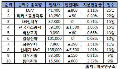 [버핏연구소=홍지윤 기자] 10일 코스피 시장에서 외국인의 연속 순매수 상위 5개 종목은 LG우(003555), 메리츠금융지주(138040), LG전자우(066575), 한국가스공사(036460), 비상교육(100220)이다.