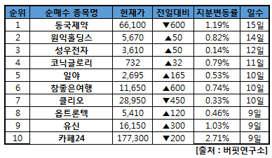 [버핏연구소=이윤지 기자] 10일 코스닥 시장에서 외국인의 연속 순매수 상위 5개 종목은 동국제약(086450), 원익홀딩스(030530), 성우전자(081580), 코닉글로리(094860), 일야(058450)이다.