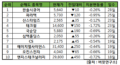 [버핏연구소=이윤지 기자] 10일 코스닥 시장에서 외국인의 연속 순매도 상위 5개 종목은 한솔시큐어(070300), 파라텍(033540), 신스타임즈(056000), 테크윙(089030), 국순당(043650)이다.