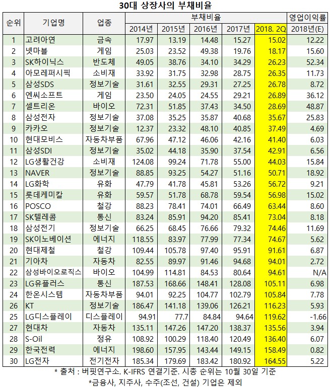 이번 조사에서는 금융사, 지주사, 수주업(건설,조선)은 제외됐다. 수주업에 속하는 조선사나 건설사는 선박이나 건물을 수주할 때 받는 계약금(선수금. Advances from customers)이 부채로 인식된다.(끝)