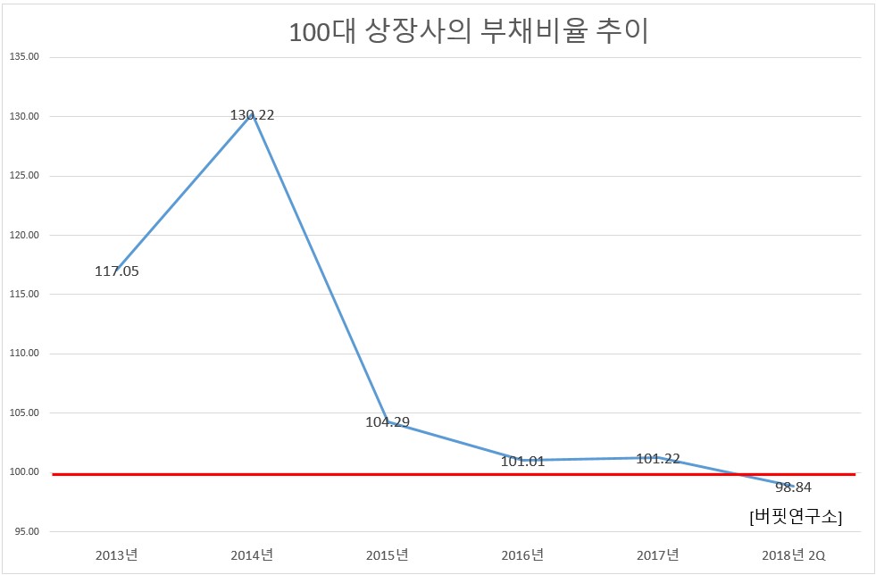 투자 및 경영 정보 사이트 버핏연구소(대표 홍순화)가 금융감독원과 한국거래소의 전자공시 자료롤 바탕으로 2분기 보고서 기준 국내 100대 상장사의 평균 부채 비율을 조사한 결과 98.84%였다. 100대 상장사의 부채비율이 두자리수로 떨어진 것은 2007년(84.3%) 이후 11년만에 처음이다.