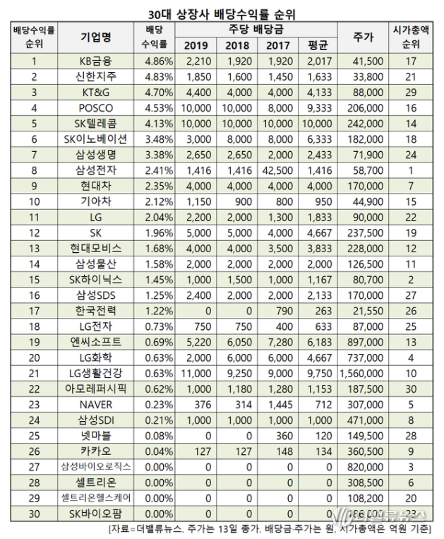 시가총액 상위 종목인 삼성전자(2.41%), 현대차(2.35%)는 각각 8, 9위를 차지했다. 삼성전자의 평균 주당 배당금 1,416원은 2018, 2019년 2년 평균치이다. 2017년 배당금은 액면분할 실시 이전이어서 제외했다.