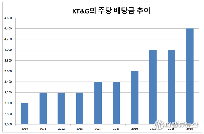KT&G의 주당 배당금은 경기부침과 무관하게 증가하는 추세를 보이고 있다. 2010년 3,000원이었다가 지난해 4,400원으로 증가했다.