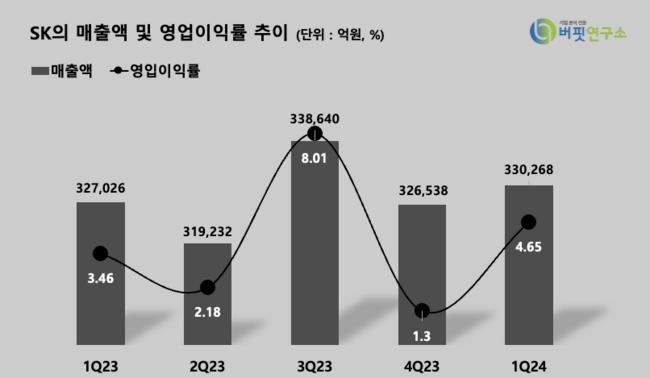 SK 최근 분기 매출액 및 영업이익률 추이. [이미지=버핏연구소]