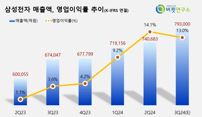 삼성전자 최근 분기별 매출액 및 영업이익률 추이. [이미지= 버핏연구소]