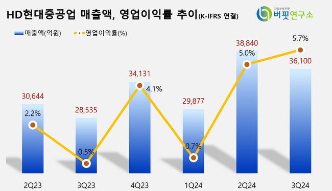 HD현대중공업의 3분기 실적은 매출액 3조6100억원, 영업이익 2062억원을 기록했다(이하 K-IFRS 연결). 이는 전년대비 각각 26.5%, 1498% 증가한 수치다. HD현대중공업은 상선 부문에서 영업일수 감소에도 생산성 개선으로 예상보다 양호한 매출을 기록했고, 해양부문에서는 체인지오더에 따른 일회성 이익 238억원이 발생하면서 흑자전환에 성공했으며, 엔진 부문에서도 단가 상승 등의 영향으로 현재 수익성 개선세가 계속되고 있다고 밝혔다.