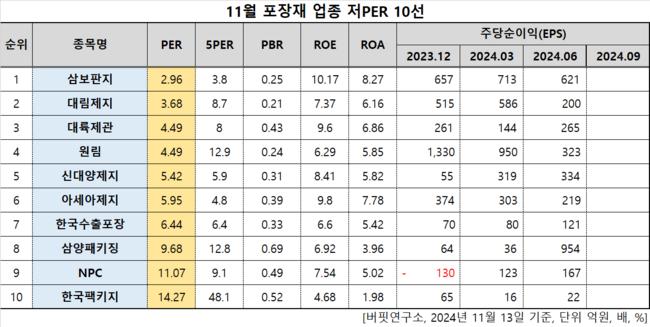 11월 포장재주 저PER 10선. [자료=버핏연구소]