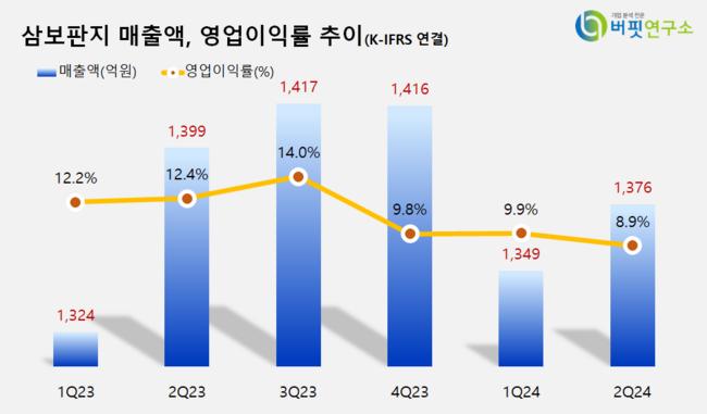 삼보판지는 지난 2분기 매출액 1376억원, 영업이익 123억원을 기록하며 전년 동기 대비 각각 1.64%, 29.31% 감소했다(K-IFRS 연결).