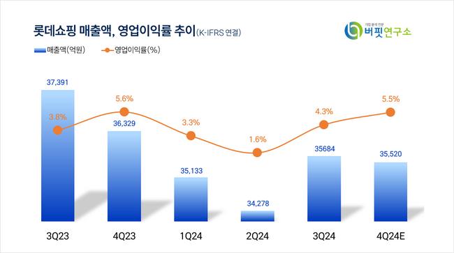 이승은 유안타 증권 연구원은 "롯데쇼핑이 올해 4분기 매출액 3조5520억원(전년대비 -2%), 영업이익 1970억원을 기록할 것"이라고 언급했다. 또 "매출액 감소에 따른 외형 축소 우려가 뒤따르는 가운데 오는 2026년 이후 본격적인 매출 성장과 해외 점포 확장을 통한 매출 증가가 기대된다"며 "특히 내년에는 싱가포르홀딩스를 설립해 동남아시아 확장을 통한 수익성 확대를 계획하고 있다"고 전했다.