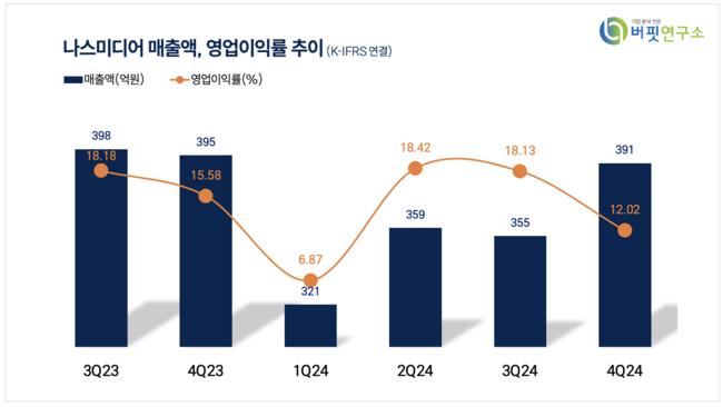 이화정 NH투자증권 연구원은 “정치적 불안감으로 인한 소비 심리 위축으로 국내 광고경기 회복은 아직 요원하지만 비우호적인 업황 속에서도 나스미디어는 신규 매체 확장(OTT, 옥외) 및 사업 효율화(자회사 매각)를 통해 성장 모멘텀을 지속적으로 확보해나가고 있다”고 분석했다.