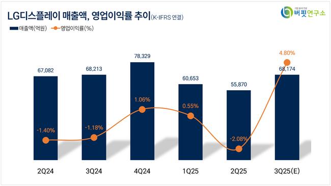 김소원 키움증권 애널리스트는 “3분기 연결 매출액은 6조7890억원, 영업이익은 4855억원으로 당사 추정치와 시장 기대치를 크게 웃돌 것”이라며 “POLED는 아이폰17 시리즈 내 점유율 확대와 신형 워치 경쟁사 철수 효과로 역대 최대 수익성이 기대되고, WOLED 역시 TV와 게이밍 모니터 수요 강세와 광저우 라인 감가상각 종료 효과로 안정적 흑자를 이어갈 전망”이라고 분석했다.
