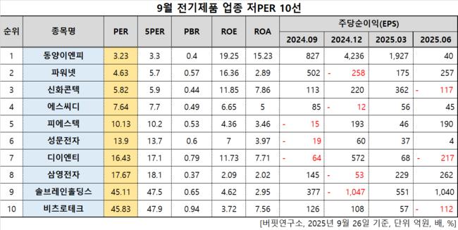 9월 전기제품주 저PER 10선. [자료=버핏연구소]