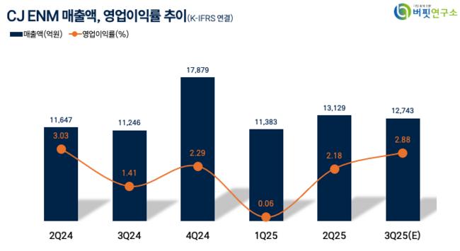 또한 “2025년 영업이익은 1300억원(전년동기대비 +55%), 2026년은 2300억원(전년동기대비 +77%)으로 예상된다”며 “12개월 선행 주당순이익(EPS) 5240원에 목표 주가수익비율(P/E) 17배를 적용해 목표주가를 산출했다”고 밝혔다. 그는 “CJ ENM과 CJO 합병 전의 평균 멀티플 21배 대비 20% 할인 적용이며, 합병 전의 합산 영업이익 2500억원 회복 시 P/E 21배 적용도 가능하다”고 덧붙였다.