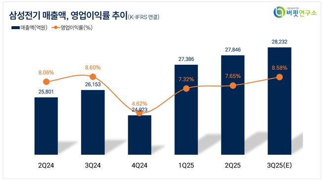 고선영 유안타증권 애널리스트는 “3분기 연결기준 매출액은 2조8516억원(전년동기대비 +9.0%), 영업이익은 2477억원(전년동기대비 10.2%)으로 시장 기대치를 충족할 전망”이라며 “특히 IT 중심이던 컴포넌트 사업 내 비중이 서버·전장으로 확대되면 고부가가치 MLCC 탑재가 늘고 있다”고 설명했다.
