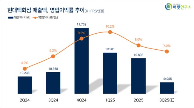 장민지 교보증권 애널리스트는 “3분기 연결 매출액 1조55억원(전년동기대비 -3%), 영업이익 706억원(전년동기대비 +9.3%, 영업이익률 7%)”이고 “백화점은 총매출액 1조7344억원(전년동기대비 +2.6%), 영업이익 753억원(전년동기대비 +6.1%, 영업이익률 4.3%)”으로 전망했다.