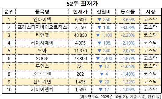 52주 최고가. [이미지=버핏연구소] 이어 프레스티지바이오로직스(334970, 3150원, ▼ 100, -3.08%), 티앤엘(340570, 48850원, ▼ 1,100, -2.2%), 케이지에이(455180, 4895원, ▼ 105, -2.1%), 오아(342870, 11370원, ▼ 240, -2.07%), SOOP(067160, 73300원, ▼ 1,400, -1.87%), 루멘스(038060, 721원, ▼ 12, -1.64%), 소프트센(032680, 282원 ▼ 4, -1.4%), 신도기연(290520, 1495원, ▼ 20, -1.32%), 케이이엠텍(106080, 1580원, ▼ 17, -1.06%) 순이다.