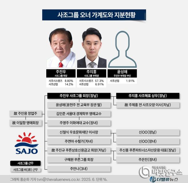 사조그룹 오너 가계도와 지분현황. 2025. 6. 단위 %.