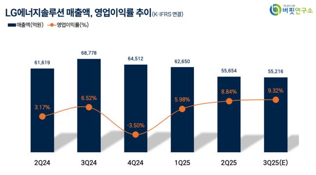 정원석 iM증권 애널리스트는 “3분기 실적은 매출액 5조7000억원(전년동기대비 -17%), 영업이익 6010억원(전년동기대비 +34%)으로 시장 기대치를 상회했다”며 “전기차(EV) 부문은 세액공제 종료를 앞둔 완성차 업체들의 재고조정 영향으로 매출이 감소했으나, 최소 구매 물량 미달분 보상금 반영으로 수익성이 개선됐다”고 밝혔다.