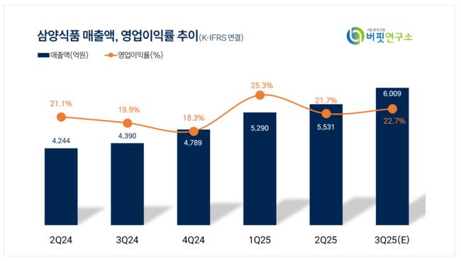조상훈 신한투자증권 애널리스트는 삼양식품의 3분기 매출액과 영업이익이 각각 6029억원(전년동기대비 +37.3%), 1335억원(전년동기대비 +52.9%)으로 시장 전망치에 부합할 것이라고 내다봤다. 미국 상호관세 부과에 따른 원가율 상승에도 판매관리비 절감으로 높아진 시장 기대치를 충족 가능할 것이라고 전망했다.