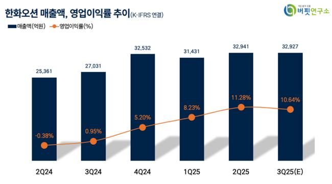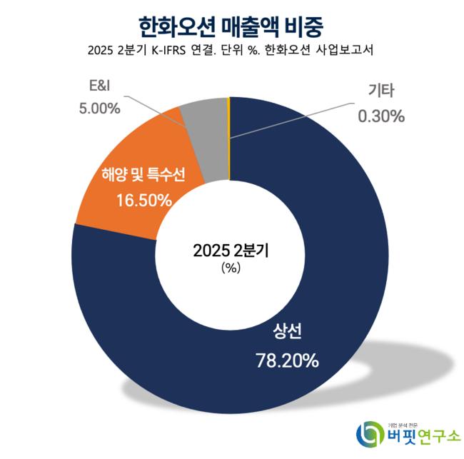 한화오션 매출액 비중. [자료=버핏연구소]그는 “3분기 한화오션은 양밍해운 16K TEU 컨테이너선 7척, 액화천연가스(LNG) 운반선 1척, 초대형 원유운반선(VLCC) 5척 등 총 14척을 신규 수주하며 양호한 흐름을 이어갔다”며 “미국 필리조선소의 그룹사향 수주 진행과 오스탈(Austal) 잔여 지분 확보, 캐나다 잠수함 사업 등 해외 특수선 부문 모멘텀도 남아 있다”고 분석했다.
